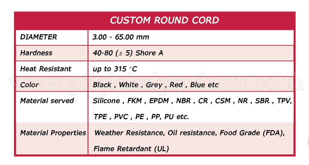 Silicone Round Cord size DIA.4.5mm, high heat resistance +220°C, high flexibility, good recovery, no deformation, easy to use, resistant to steam, resistant to zone transfer and excellent environmental resistance. Long service life Food Grade (FDA) can be used in the food industry Tel : 0-2257-7145 / MB : 098-253-9956 / Line OA : @PTIGLOBAL