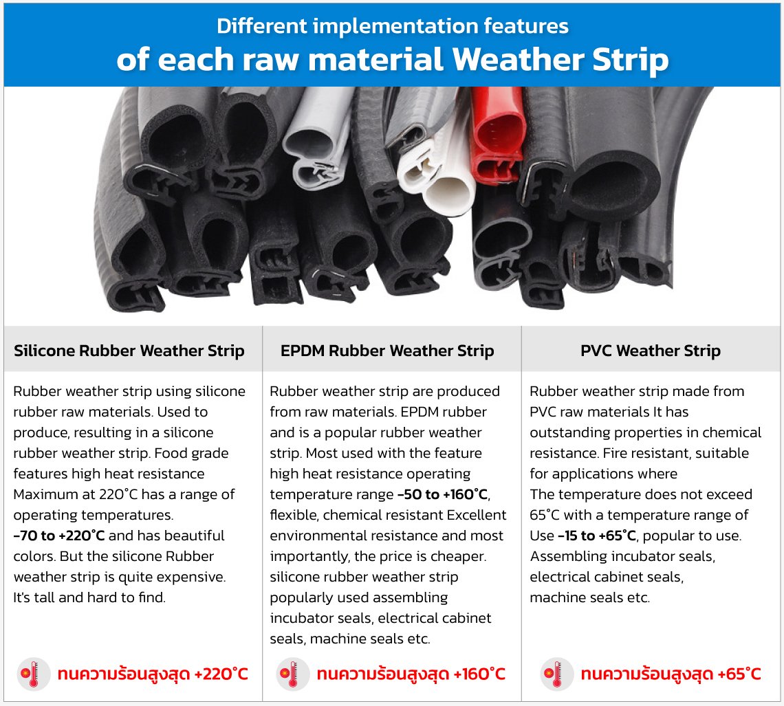 Rubber weather strip are seals that have been produced by Co-Extrusion Process with steel wire or some call keel inside. Helps in bending into corners Easy to assemble And most importantly, it can increase strength as well. Rubber weather strip are usually made from 3 main raw materials, which are EPDM rubber, silicone rubber and PVC. There are different implementation features as follows.