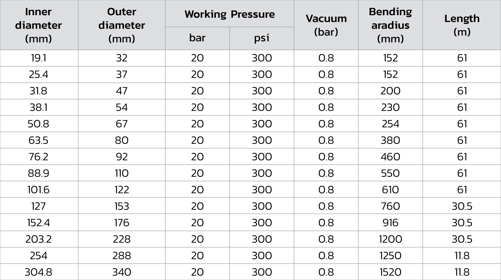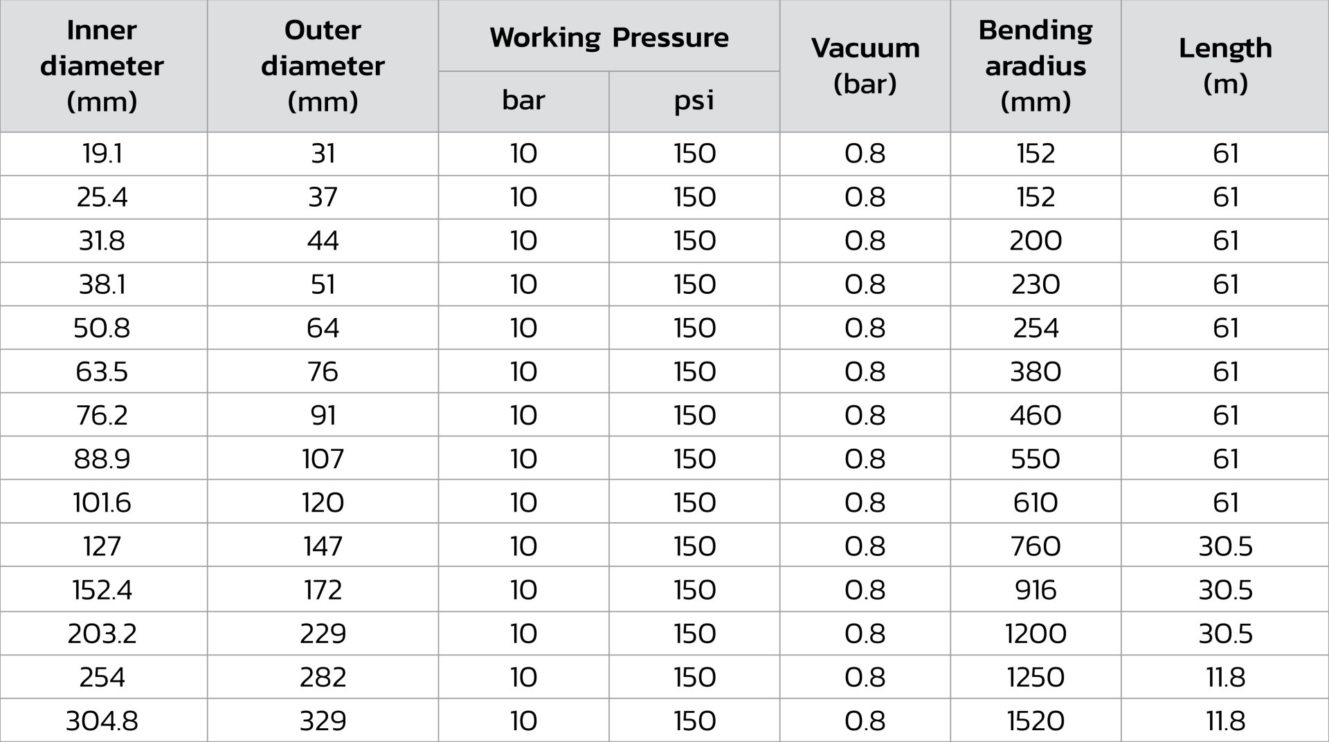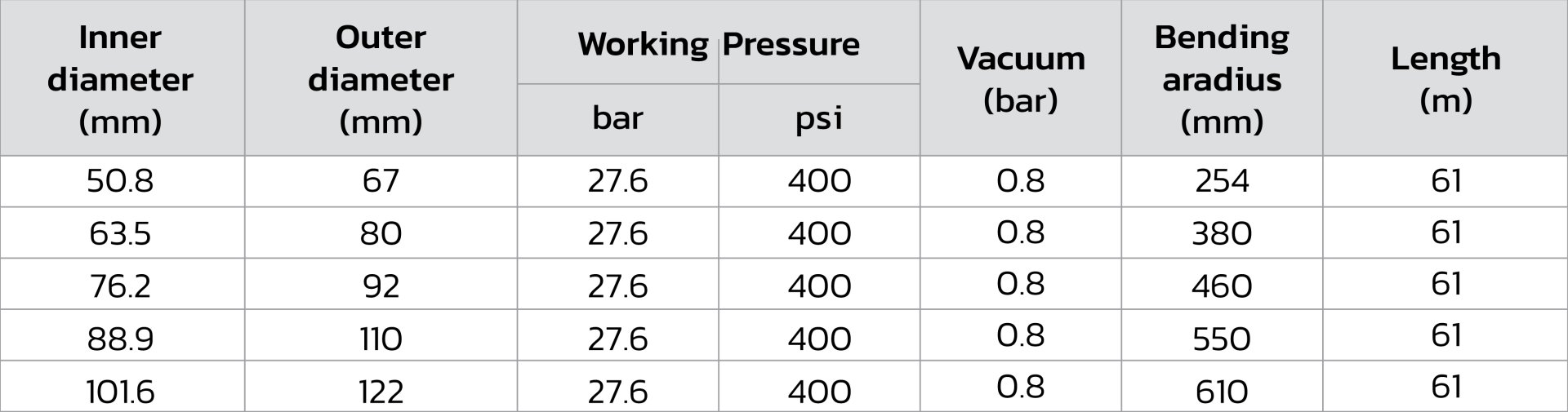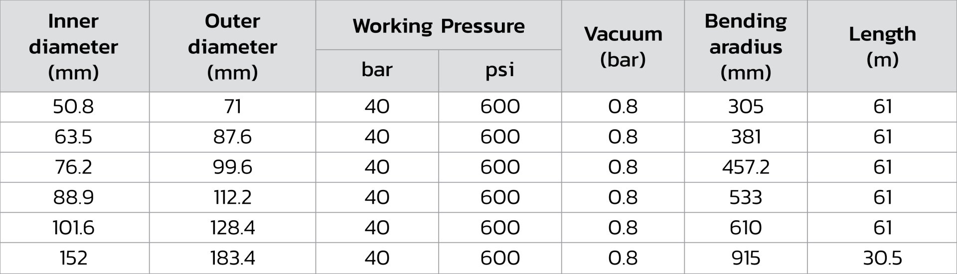 Nitrile petrol suction hose 15 psi consists of 3 important parts, including the inner tube, reinforced and cover layers. The inner tune is made of black smooth nitrile rubber, which is resistant to oil and other hydrocarbons, both aromatic (up to 50% content) and non-aromatic types. The cover layer is made with wrapped surface using synthetic rubber with smooth or corrugated surfaces. This layer is resistant to oil, weather, ozone, abrasion, and wear enabling the hose to be used on different types of surfaces even in harsh environments. Another important layer is the reinforcement made of high strength synthetic fabric and steel wire helix skeleton. The layer allows the hose to be used with vacuum conditions (0.8 bar) and with working pressure up to 150, 300, 400 and 600 psi. Moreover, there is an inserted copper wire for ground connection and eliminating static electricity.