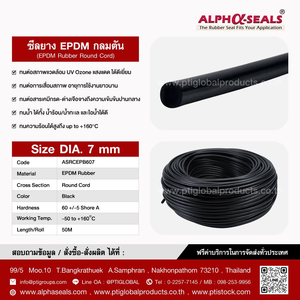 EPDM Rubber Round Cord DIA. 7 mm Excellent resistance to the environment, UV Ozone, sunlight, resistant to deterioration. Long service life Resistant to chemicals from diluted acids and alkalis to moderate concentrations. Water resistant, including hot water/seawater. and steam well Resistant to heat up to +160ºC Tel : 022577145 MB : 0982539956 / E-mail : info@ptigroups.com / Line OA : @PTIGLOBAL